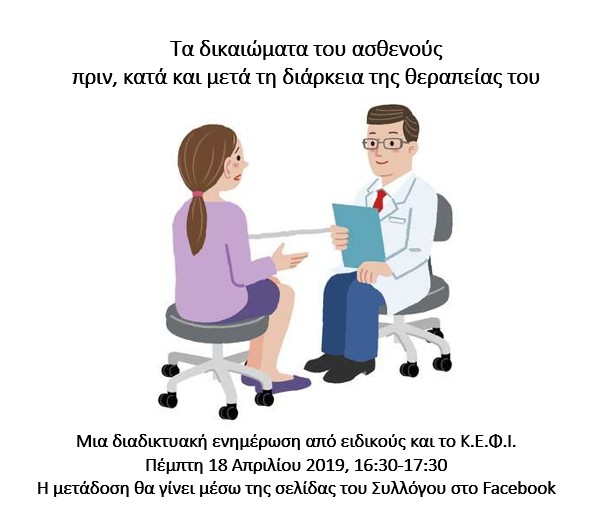 Ο Σύλλογος Καρκινοπαθών Εθελοντών Φίλων Ιατρών (Κ.Ε.Φ.Ι.) στο πλαίσιο του εορτασμού της Ευρωπαϊκής Ημέρας για τα Δικαιώματα του Ασθενούς, διοργανώνει, την Πέμπτη 18 Απριλίου 2019 (16.30-17.30), διαδικτυακό στρογγυλό τραπέζι με θέμα: