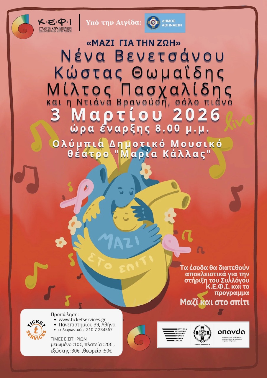 Ο Σύλλογος Καρκινοπαθών Εθελοντών - Φίλων Ιατρών «Κ.Ε.Φ.Ι.» Αθηνών διοργανώνει την Τρίτη 3 Μαρτίου ξεχωριστή εκδήλωση με τίτλο «ΜΑΖΙ ΓΙΑ ΤΗΝ ΖΩΗ». Πρόκειται για μια εκδήλωση διαφορετική αφιερωμένη στη δύναμη της ψυχής, της μουσικής, της αλληλεγγύης και της ανθρώπινης αξιοπρέπειας.