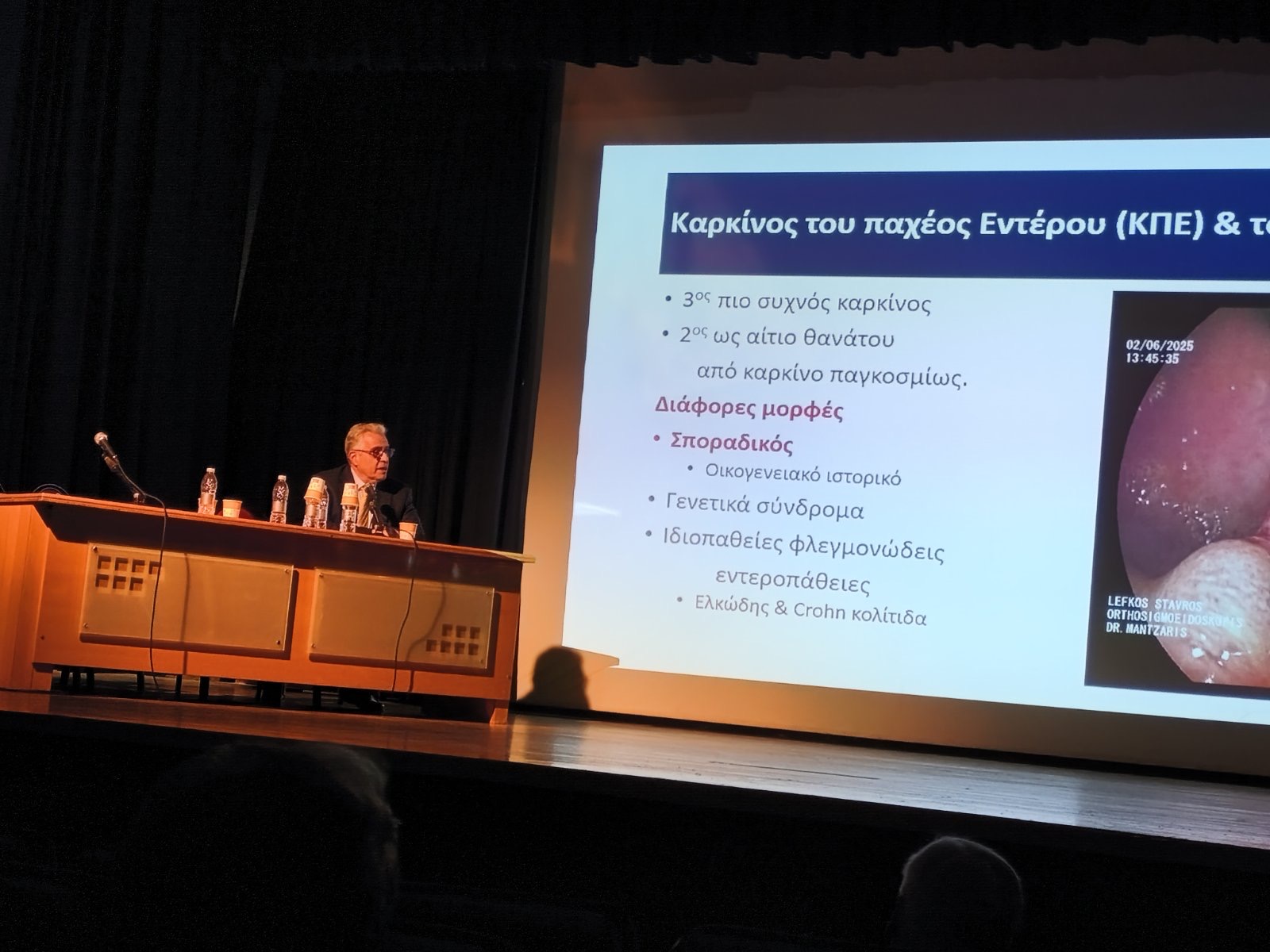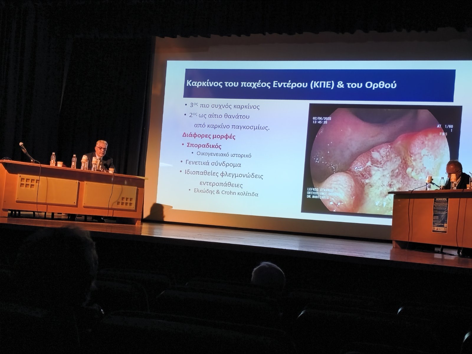Ο κ. Γεράσιμος Μάντζαρης, Γαστρεντερολόγος Διδάκτωρ Πανεπιστημίου Αθηνών MD, PhD, FEBGH (Fellow of the European Board of Gastroenterology & Hepatology) και AGAF (American Gastroenterological Association Fellow), αναφέρθηκε στον καρκίνο παχέος εντέρου και όρθου. Εξήγησε τα συμτώματα γενικά αλλά και πιο εξειδικευμένα και απαρίθμησε τους παράγοντες κινδύνου. Αναφέρθηκε στη σημασία της ηλικίας για τη διαφοροποίηση των συμπτωμάτων. Ένα γενικό μήνυμα και ταυτόχρονα προτροπή προς όλους είναι να κάνουν το τεστ αιμοσφαιρίνης κοπράνων.