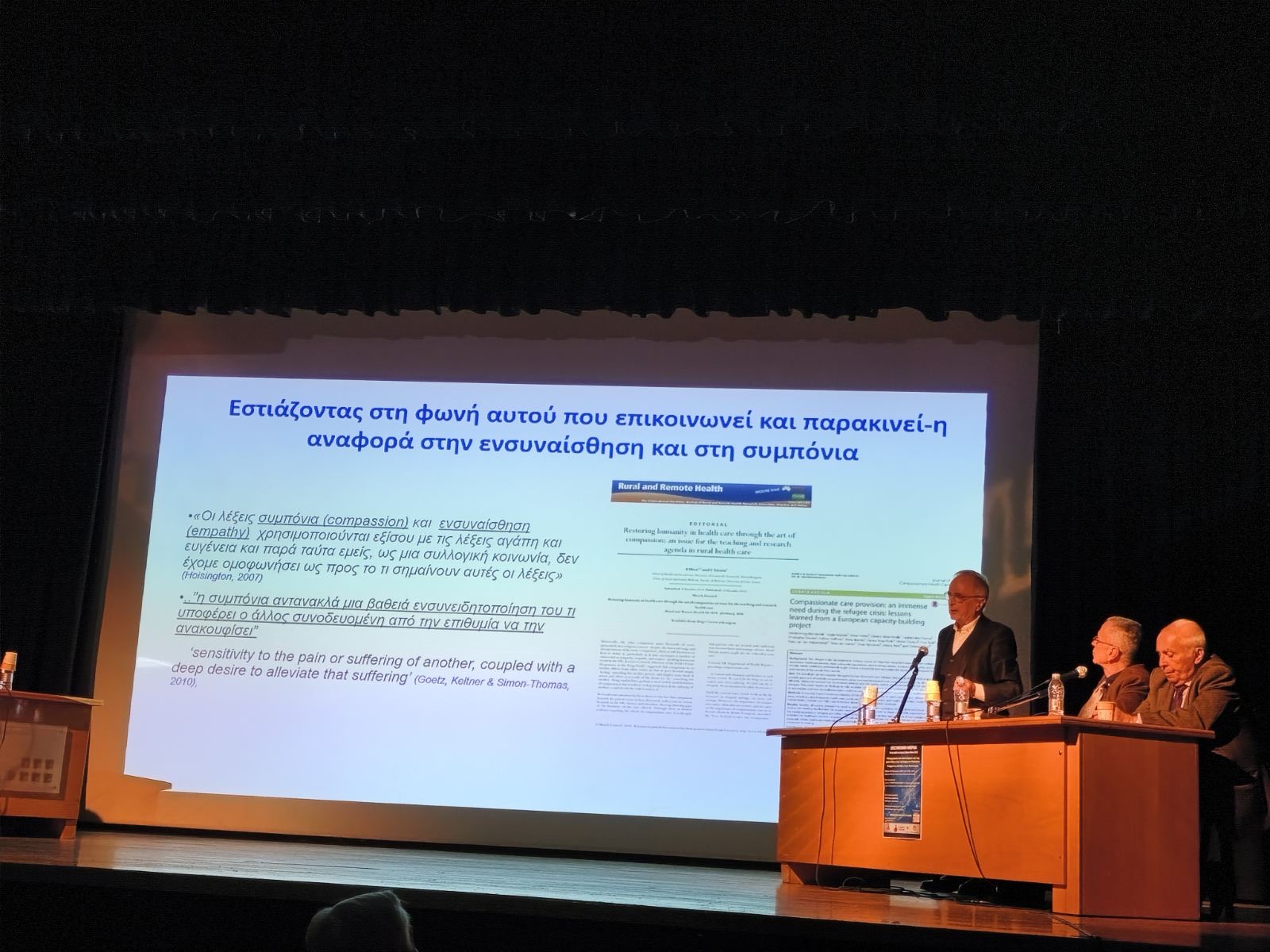 Ακολούθως, ο κ. Χρήστος Λιονής, MD, PhD, FRCGP (Hon), FWONCA, FESC Καθηγητής Γενικής Ιατρικής και Πρωτοβάθμιας Φροντίδας Υγείας, Επικεφαλής της Κλινικής Κοινωνικής και Οικογενειακής Ιατρικής Ομάδες Balint, Ιατρική Σχολή Πανεπιστημίου Κρήτης, αναφέρθηκε στην έννοια της ευημερίας, σε ρήσεις του Victor Frankle, ο οποίος μίλησε για το σώμα, την ψυχή και το πνεύμα. Οι Γενικοί Ιατροί είναι η επιτομή της πρωτοβάθμιας βαθμίδας υγείας. Αναφέρθηκε στα συμπτώματα και στη σημασία ανάγνωσης και της μετάφρασής τους από τον ίδιο τον άνθρωπο. Μίλησε για τη σημασία της προτροπής και της ενθάρρυνσης από τους ιατρούς για να αλλάξεις το μήνυμα. Η συμπόνοια αντανακλά μια βαθιά ενσυνειδητοποίηση του τι χρειάζεται ο άλλος συνοδευόμενη από την επιθυμία για προσφορά βοήθειας. Μαζί ο γιατρός και ο ασθενής λαμβάνουν την απόφαση.