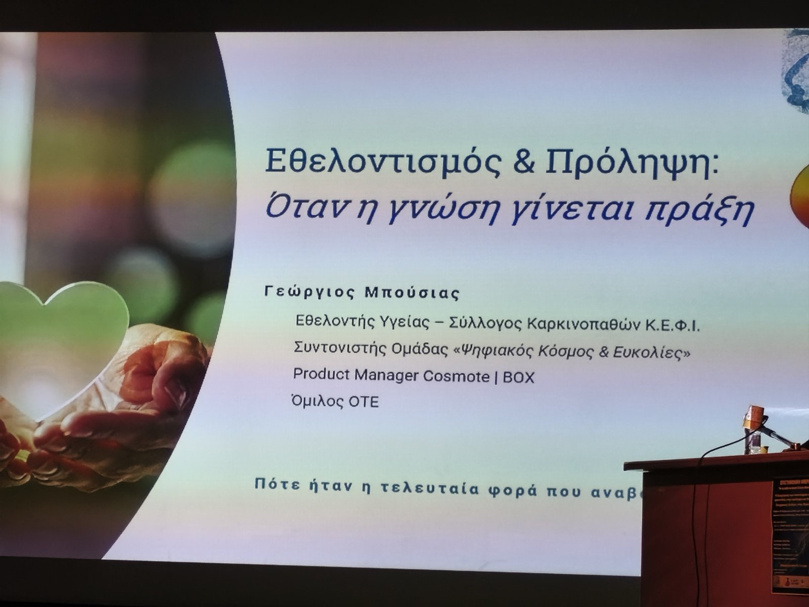 Ο κ. Γεώργιος Μπούσιας, Εθελοντής Συλλόγου Καρκινοπαθών Κ.Ε.Φ.Ι., Συντονιστής Ομάδας «Ψηφιακός Κόσμος & Ευκολίες», Product Manager – Όμιλος ΟΤΕ, ανέφερε ότι η πρόληψη δεν σκοντάφτει στην έλλειψη εξετάσεων, αλλά στο ότι συχνά δεν φτάνουμε στον άνθρωπο—στον φόβο, την αναβλητικότητα και την «ψηφιακή ανασφάλεια». Μέσα από την εμπειρία μου στο Κ.Ε.Φ.Ι. και την ομάδα «Ψηφιακός Κόσμος & Ευκολίες», βλέπω πως όταν η γνώση μεταφράζεται σε ανθρώπινη γλώσσα και συνοδεύεται από εμπιστοσύνη, γίνεται πράξη. Ο εθελοντισμός δεν αντικαθιστά τον γιατρό: χτίζει σχέση, ενδυναμώνει και κάνει την απόφαση «αξίζω να φροντίσω τον εαυτό μου» πιο πιθανή.