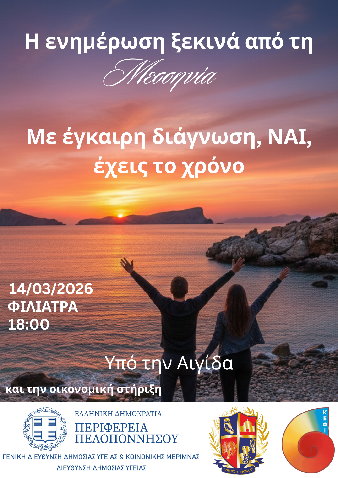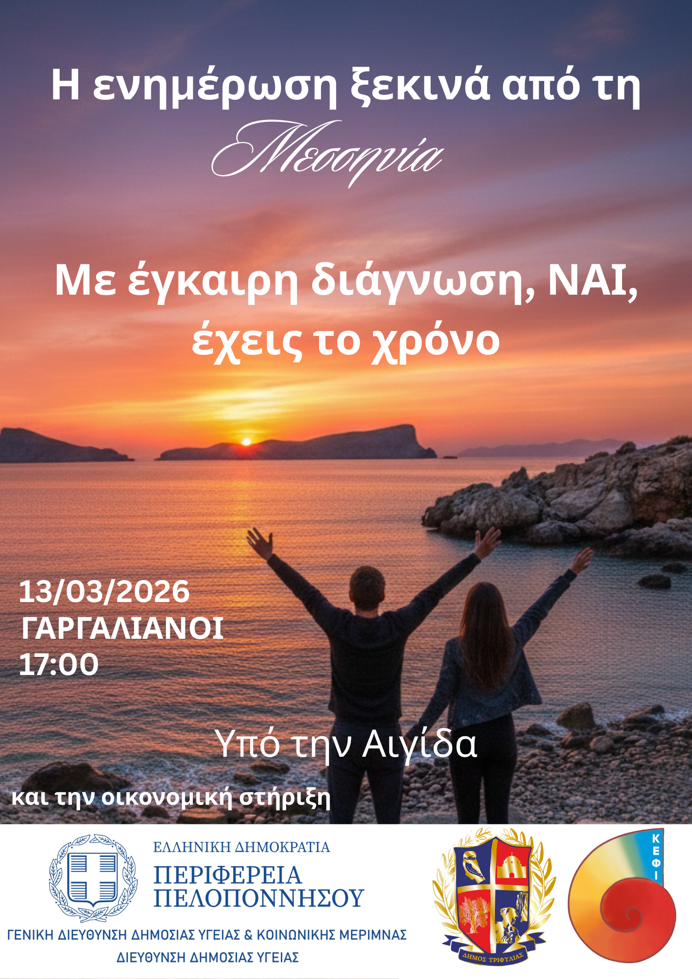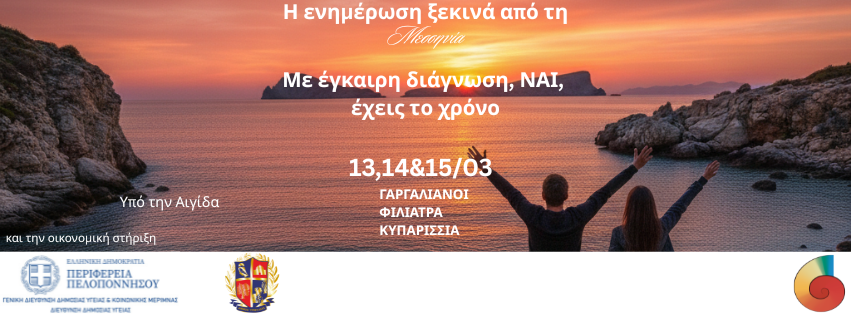 Το πρόγραμμα «Με την έγκαιρη διάγνωση, ΝΑΙ, έχεις το χρόνο» ξεκινάει από τον νομό Μεσσηνίας. Με έναρξη στους Γαργαλιάνους, έπειτα στα Φυλιατρά και τέλος στην Κυπαρισσία ο Σύλλογος «Κ.Ε.Φ.Ι.» σε συνεργασία με τοπικούς φορείς έχει σκοπό να ενημερώσει τον επαρχιακό πληθυσμό για την έγκαιρη διάγνωση, για θέματα πρόληψης και προκατάληψης.