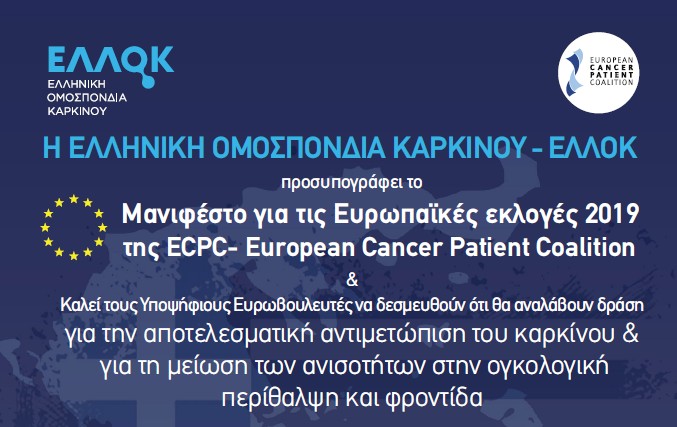 Όπως αναφέρεται συγκεκριμένα στο ΜΑΝΙΦΕΣΤΟ των Ευρωπαίων Ασθενών με Καρκίνο, η ΕΛΛΟΚ καλεί «τους Υποψήφιους Ευρωβουλευτές συλλογικά, αλλά και καθένα ΠΡΟΣΩΠΙΚΑ να στηρίξουν την αποστολή μας για την αποτελεσματική αντιμετώπιση και την καταπολέμηση των ανισοτήτων στη περίθαλψη και φροντίδα του καρκίνου στη χώρα μας και την Ευρώπη, γεφυρώνοντας τα όποια κενά με το Ευρωπαϊκό γίγνεσθαι, προωθώντας διεθνείς συνεργασίες αμφίδρομης δυναμικής, προκειμένου αφενός να υιοθετηθούν οι καλές πρακτικές από τη χώρα μας και αφετέρου να γίνουν γνωστές και να ικανοποιηθούν οι ανάγκες των Ελλήνων ασθενών με καρκίνο, των οικογενειών και των φροντιστών τους, καθώς πιστεύουμε ότι όλοι οι ασθενείς με καρκίνο, πρέπει να έχουν έγκαιρη και οικονομικά προσιτή πρόσβαση στη καλύτερη δυνατή θεραπεία και φροντίδα, κατά τη διάρκεια της ζωής τους.»