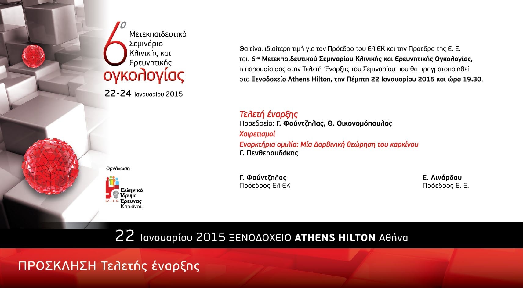 Το Ελληνικό Ίδρυμα Έρευνας Καρκίνου διοργανώνει το 6ο Μετεκπαιδευτικό Σεμινάριο Κλινικής & Ερευνητικής Ογκολογίας στις 22-24 Ιανουαρίου 2015, στο ξενοδοχείο Athens Hilton.