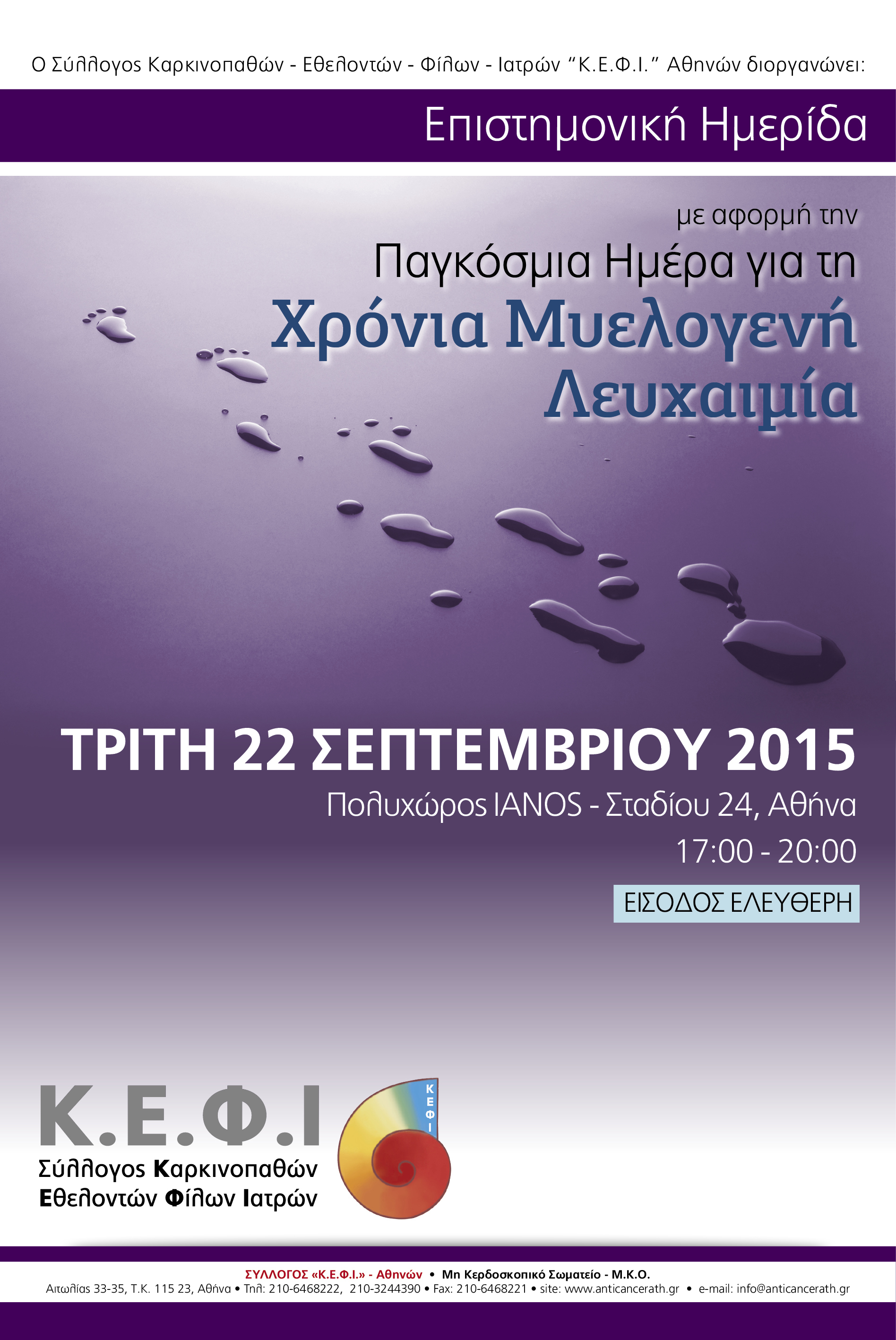 Ο Σύλλογος Καρκινοπαθών- Εθελοντών- Φίλων- Ιατρών «Κ.Ε.Φ.Ι.» Αθηνών, με αφορμή την Παγκόσμια Ημέρα για τη Χρόνια Μυελογενή Λευχαιμία (ΧΜΛ) και σε μια προσπάθεια ενημέρωσης και ευαισθητοποίησης για τη νόσο, διοργανώνει Επιστημονική Ημερίδα την Τρίτη 22 Σεπτεμβρίου 2015 και ώρα 17:00-20:00, με είσοδο ελεύθερη για το κοινό.