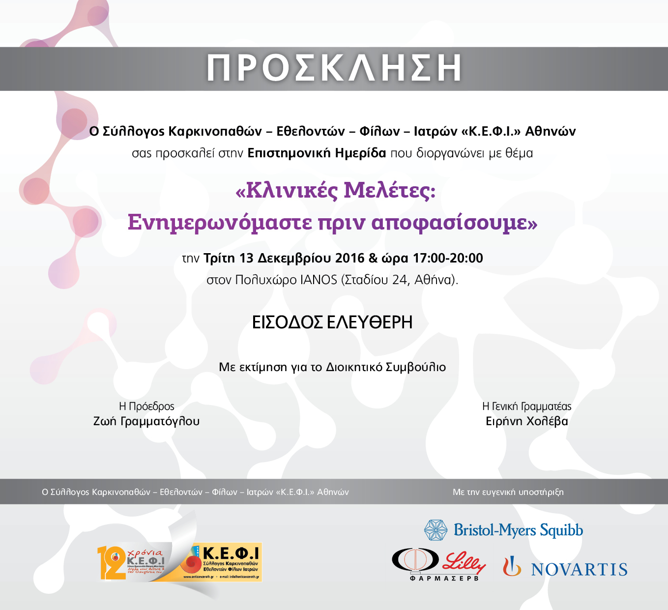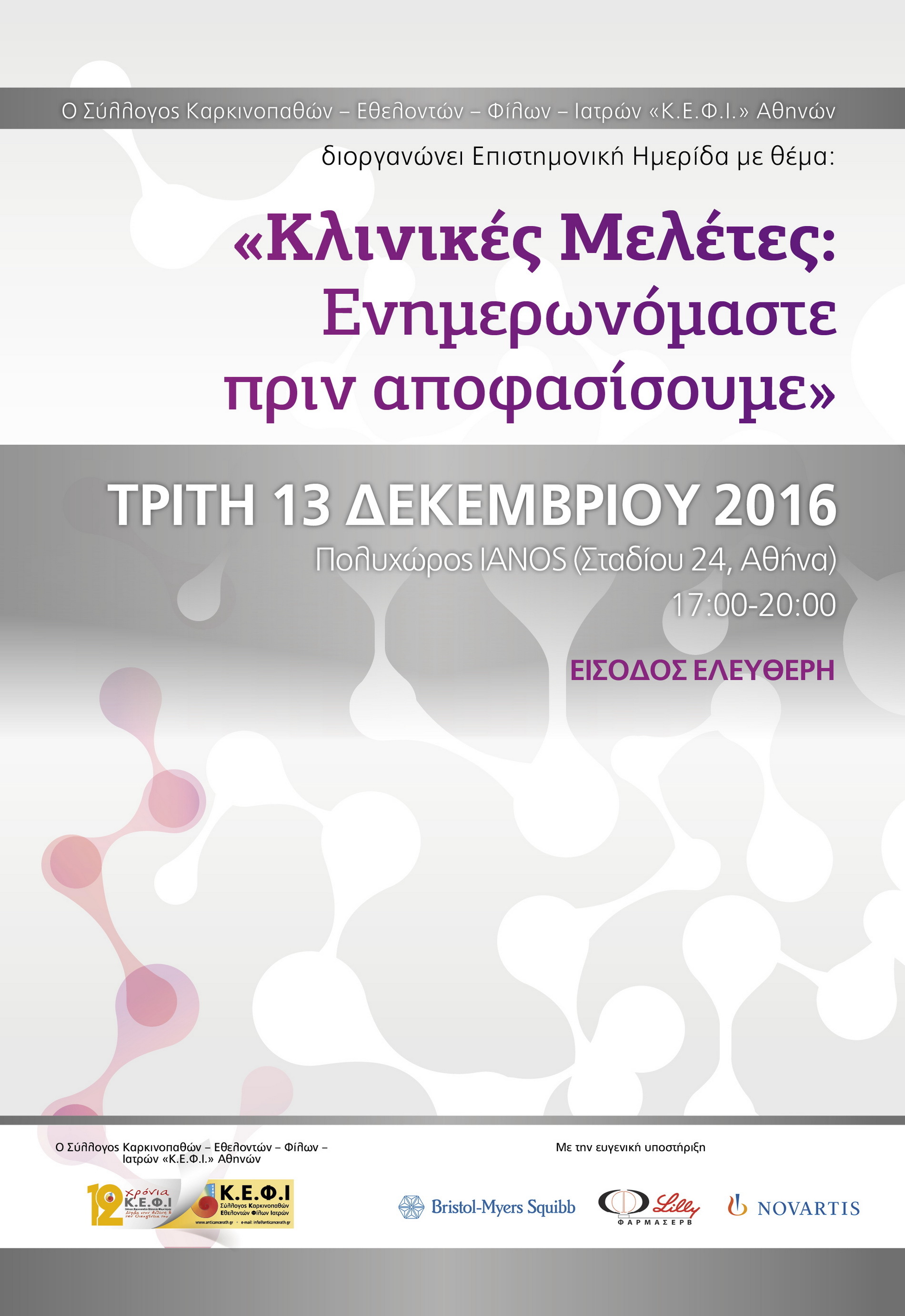 Ο Σύλλογος Καρκινοπαθών-Εθελοντών-Φίλων-Ιατρών «Κ.Ε.Φ.Ι.» Αθηνών διοργανώνει Επιστημονική Ημερίδα, την Τρίτη 13 Δεκεμβρίου 2016 και ώρα 17:00-20:00, στον Πολυχώρο IANOS (Σταδίου 24, Αθήνα), με είσοδο ελεύθερη για το κοινό.