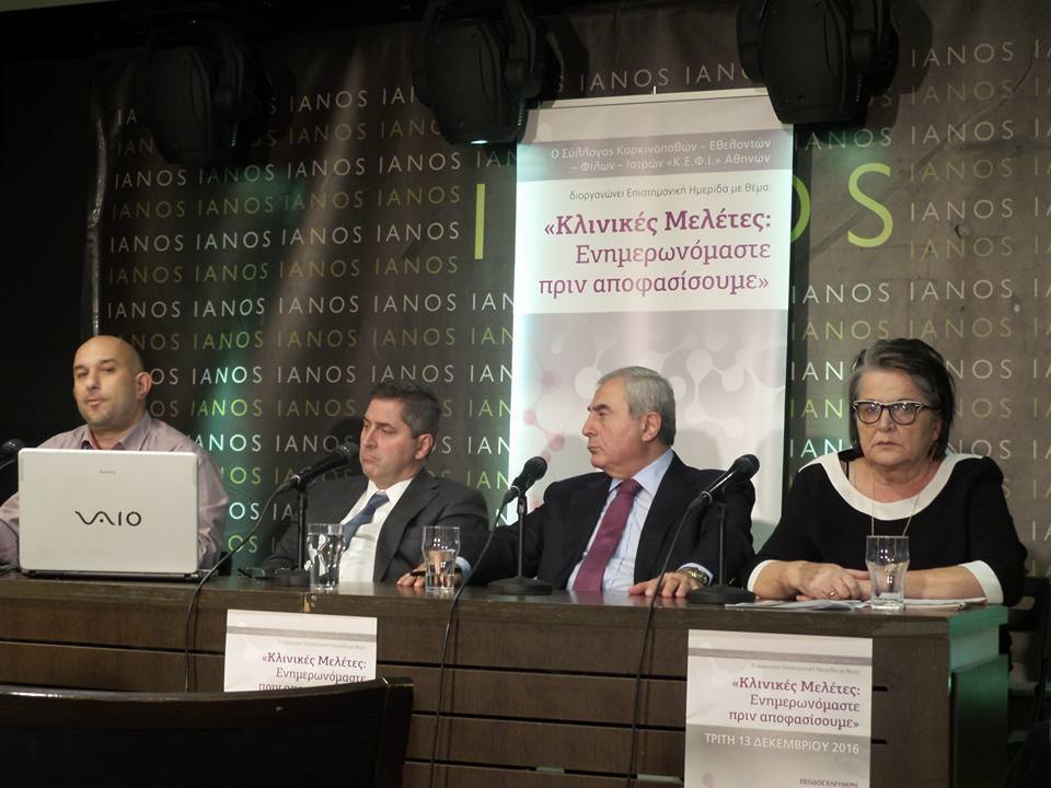 Ακολούθησε η ομιλία του κ. Χρήστου Χριστοδούλου, Παθολόγου - Ογκολόγου, Διευθυντή Β' Ογκολογικής Κλινικής, Νοσοκομείο Metropolitan, ο οποίος τόνισε: «Οι υπάρχουσες δυνατότητες ίασης με τις καθιερωμένες θεραπείες στον καρκίνο είναι περιορισμένες. Η ηθική αναγκαιότητα κλινικών μελετών είναι αναμφισβήτητη. Οι κλινικές μελέτες, στις οποίες δοκιμάζονται καινούρια φάρμακα, ή καινούριες θεραπευτικές μέθοδοι, αποτελούν το μόνο επιστημονικά αποδεκτό τρόπο σύγκρισης νεοτέρων θεραπειών με τις καθιερωμένες. Μεγαλύτερη συμμετοχή ασθενών σε κλινικές μελέτες μεταφράζεται σε ταχύτερες απαντήσεις σε κρίσιμα ερευνητικά ερωτήματα και κατά συνέπεια σε καλύτερη θεραπεία των κακοήθων νεοπλασιών».