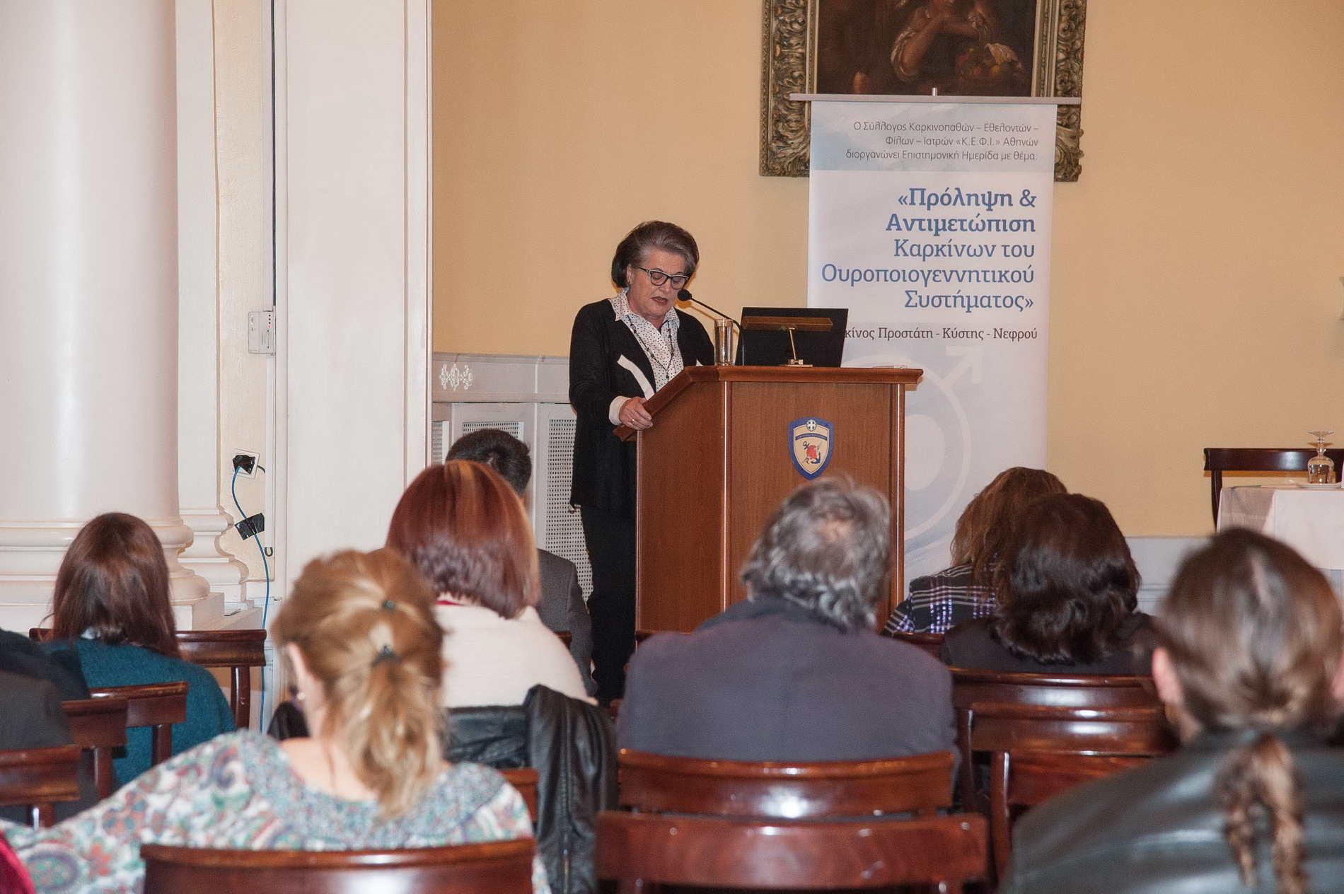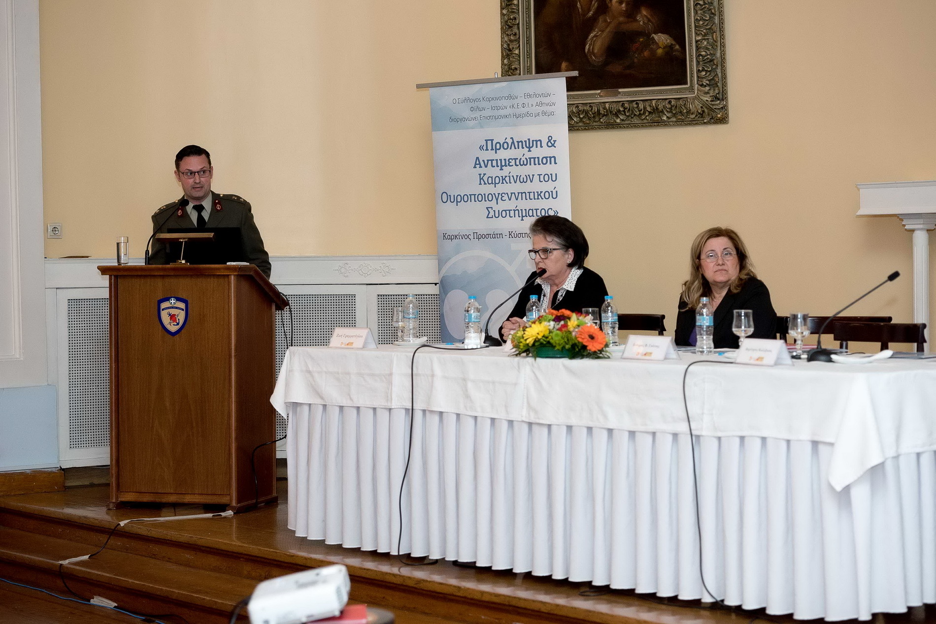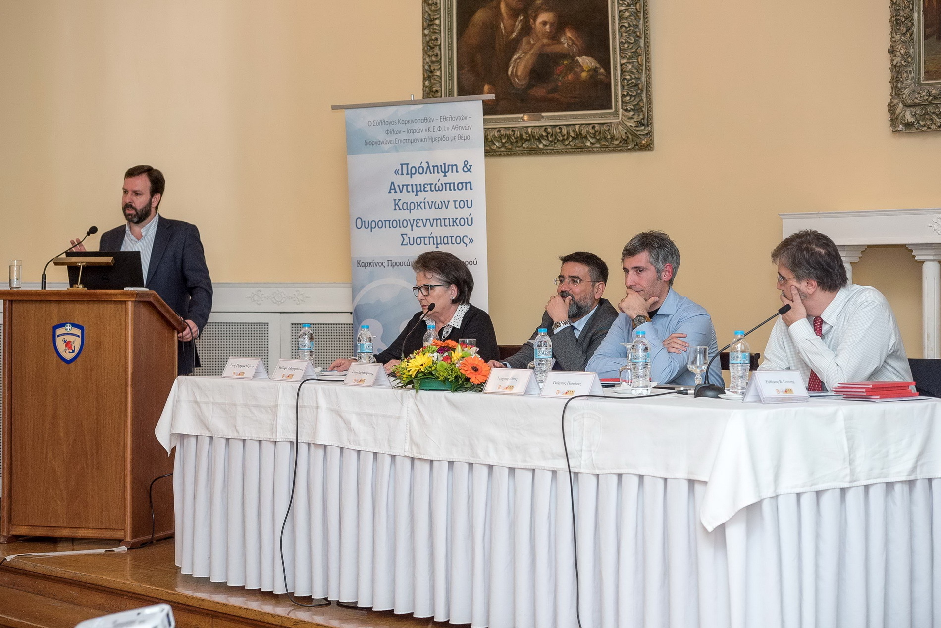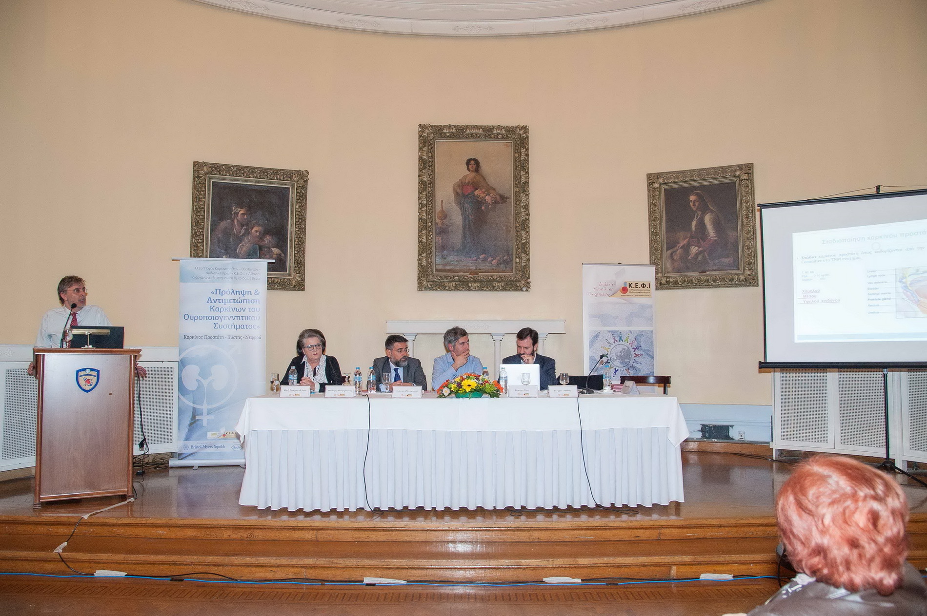 Η πρώτη επιστημονική ενότητα άρχισε με την ομιλία του κ. Θεόδωρου Καλογερόπουλου, Χειρουργού Ουρολόγου FEBU, Επιμελητή Β' Ουρολογικού Τμήματος Α.Ο.Ν.Α. «Αγ. Σάββας», ο οποίος, αναφερόμενος στην πρόληψη & αντιμετώπιση των καρκίνων του ουροποιογεννητικού συστήματος, επεσήμανε τα συμπτώματα που υποδηλώνουν πάθηση του προστάτη, τους παράγοντες κινδύνου (ηλικία, οικογενειακό ιστορικό, φυλή, διατροφή), τους τρόπους διάγνωσης (δακτυλική εξέταση, PSA, Διορθρικό υπερηχογράφημα προστάτη), τις εξετάσεις που έπονται της διάγνωσης, καθώς επίσης και τους τρόπους θεραπείας (χειρουργείο, ακτινοβολία, χημειοθεραπεία).