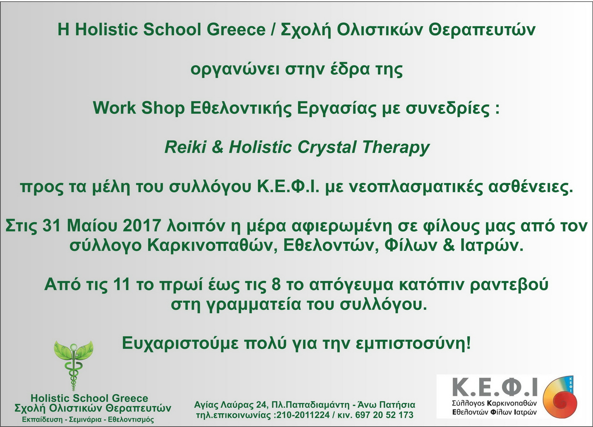 Η Holistic School Greece / Σχολή Ολιστικών Θεραπευτών διοργανώνει Workshop Εθελοντικής Εργασίας με συνεδρίες "Reiki & Holistic Crystal Therapy" για τα Μέλη - Ασθενείς του Συλλόγου Καρκινοπαθών - Εθελοντών - Φίλων - Ιατρών «Κ.Ε.Φ.Ι.» Αθηνών.