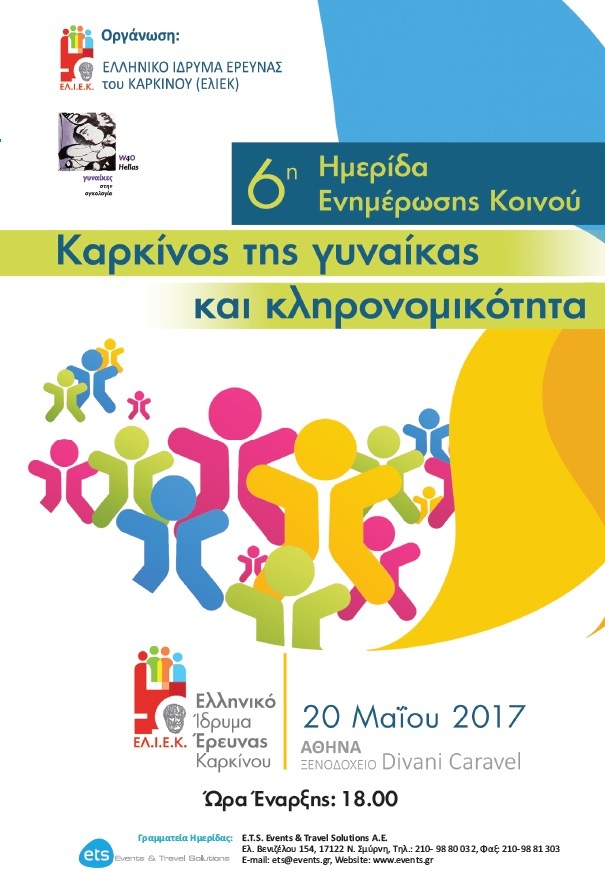 Το Ελληνικό Ίδρυμα Έρευνας του Καρκίνου - ΕλΙΕΚ & οι Γυναίκες στην Ογκολογία W4O διοργανώνουν την 6η Ημερίδα Ενημέρωσης Κοινού, με θέμα: «Καρκίνος της γυναίκας & κληρονομικότητα», το Σάββατο 20 Μαΐου 2017 & ώρες 18:00-21:00, στο ξενοδοχείο Divani Caravel στην Αθήνα.