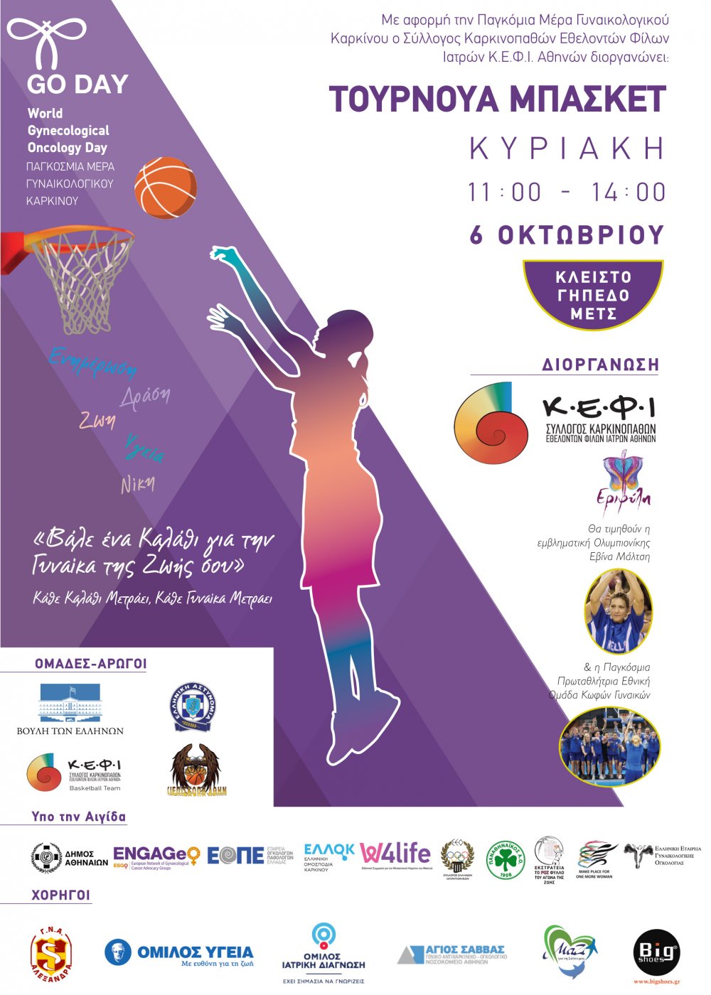 Ο Σύλλογος Καρκινοπαθών Εθελοντών Φίλων Ιατρών Κ.Ε.Φ.Ι. Αθηνών και η «Εριφύλη» Κ.Ε.Φ.Ι. με αφορμή την Παγκόσμια Ημέρα Γυναικολογικού Καρκίνου «GO Day» (Oncology Gynaecological day) που ορίστηκε για πρώτη φορά φέτος από τον Παγκόσμιο Οργανισμό Υγείας η 20η Σεπτεμβρίου, διοργανώνουν με την υποστήριξη της ESGO/ENGAGe Τουρνουά Μπάσκετ την Κυριακή 6 Οκτωβρίου και ώρα 11:00-14:00 στο κλειστό γήπεδο του ΜΕΤΣ.