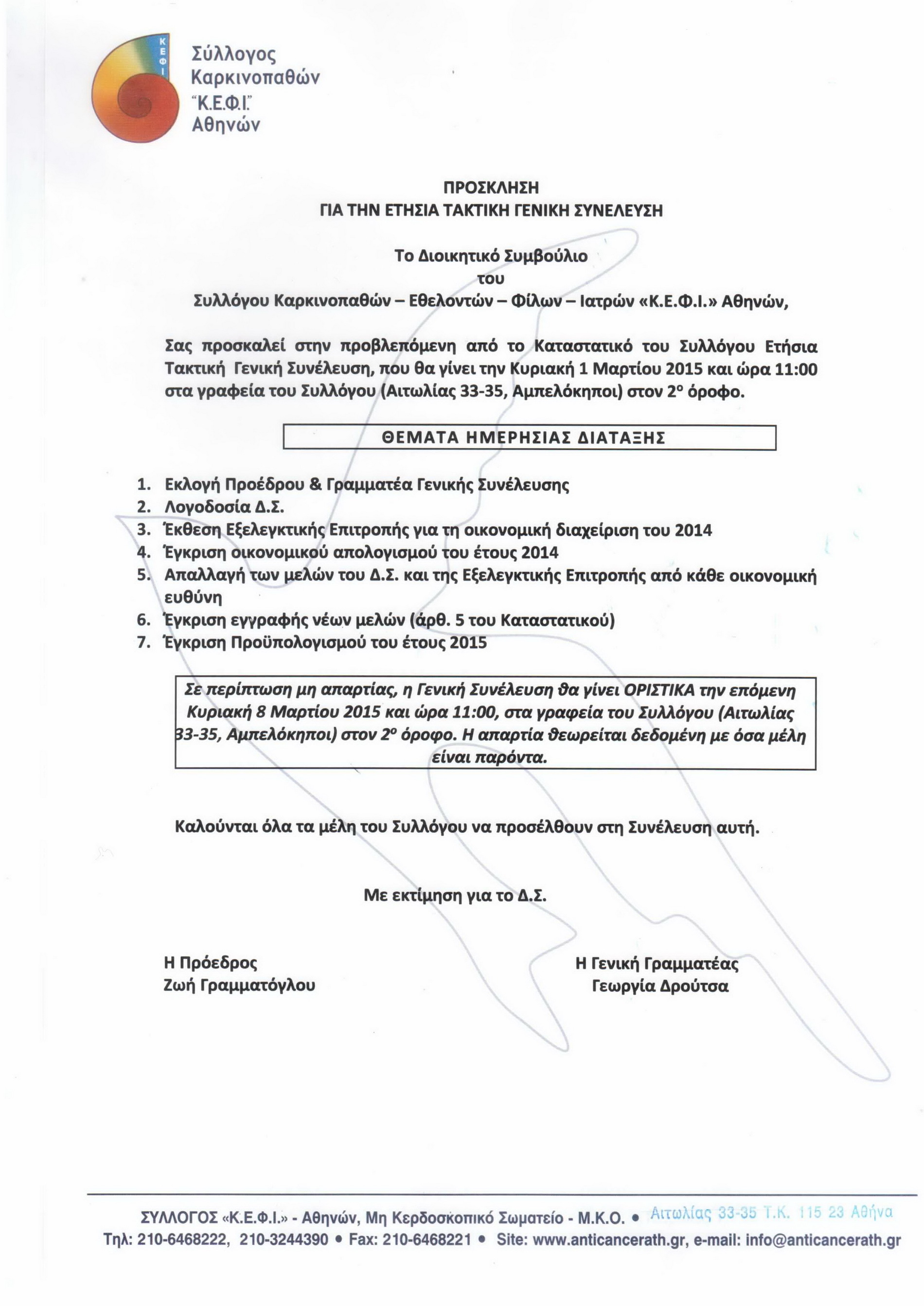 Το Διοικητικό Συμβούλιο του Συλλόγου Καρκινοπαθών - Εθελοντών - Φίλων - Ιατρών «Κ.Ε.Φ.Ι.» Αθηνών σας προσκαλεί στην προβλεπόμενη από το Καταστατικό του Συλλόγου Ετήσια Τακτική Γενική Συνέλευση, που θα γίνει την Κυριακή 8 Μαρτίου 2015 και ώρα 11:00 στα γραφεία του Συλλόγου (Αιτωλίας 33-35, Αμπελόκηποι) στον 2ο όροφο.