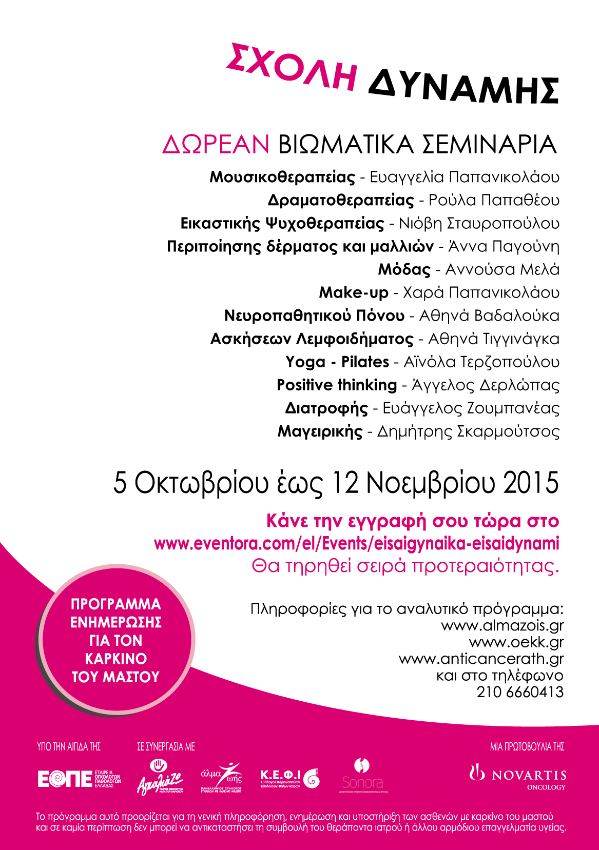 Γι αυτή τη στιγμή, που μπορεί να γίνει πραγματικότητα για κάθε μία από εμάς, για την καθημερινή προσπάθειά μας να ξαναβρούμε τον εαυτό μας και τους ανθρώπους μας, σήμερα οι γυναίκες έχουμε ακόμα μία βοήθεια! Πρόκειται για τη Σχολή Δύναμης, μια σειρά Δωρεάν Βιωματικά Σεμινάρια, που υλοποιούνται μέσα από το Πρόγραμμα Ενημέρωσης «Είσαι Γυναίκα. Είσαι δύναμη!», μία πρωτοβουλία της Novartis Oncology υπό την αιγίδα της ΕΟΠΕ και με την υποστήριξη του Συλλόγου μας.