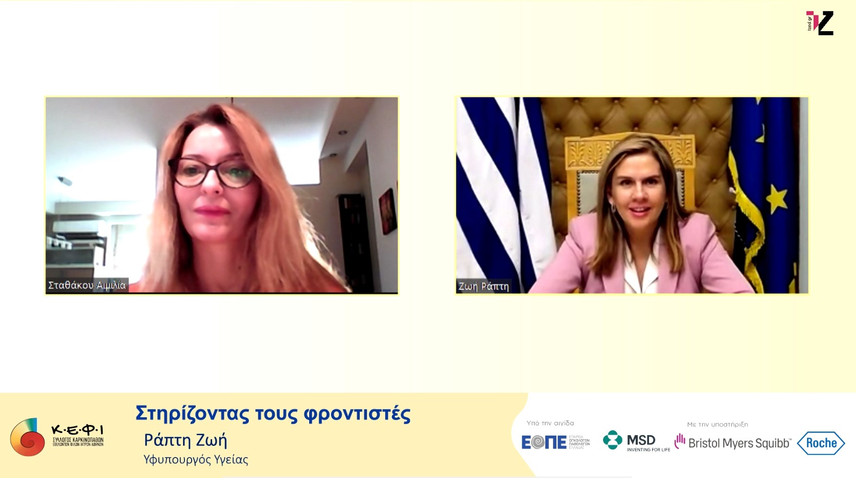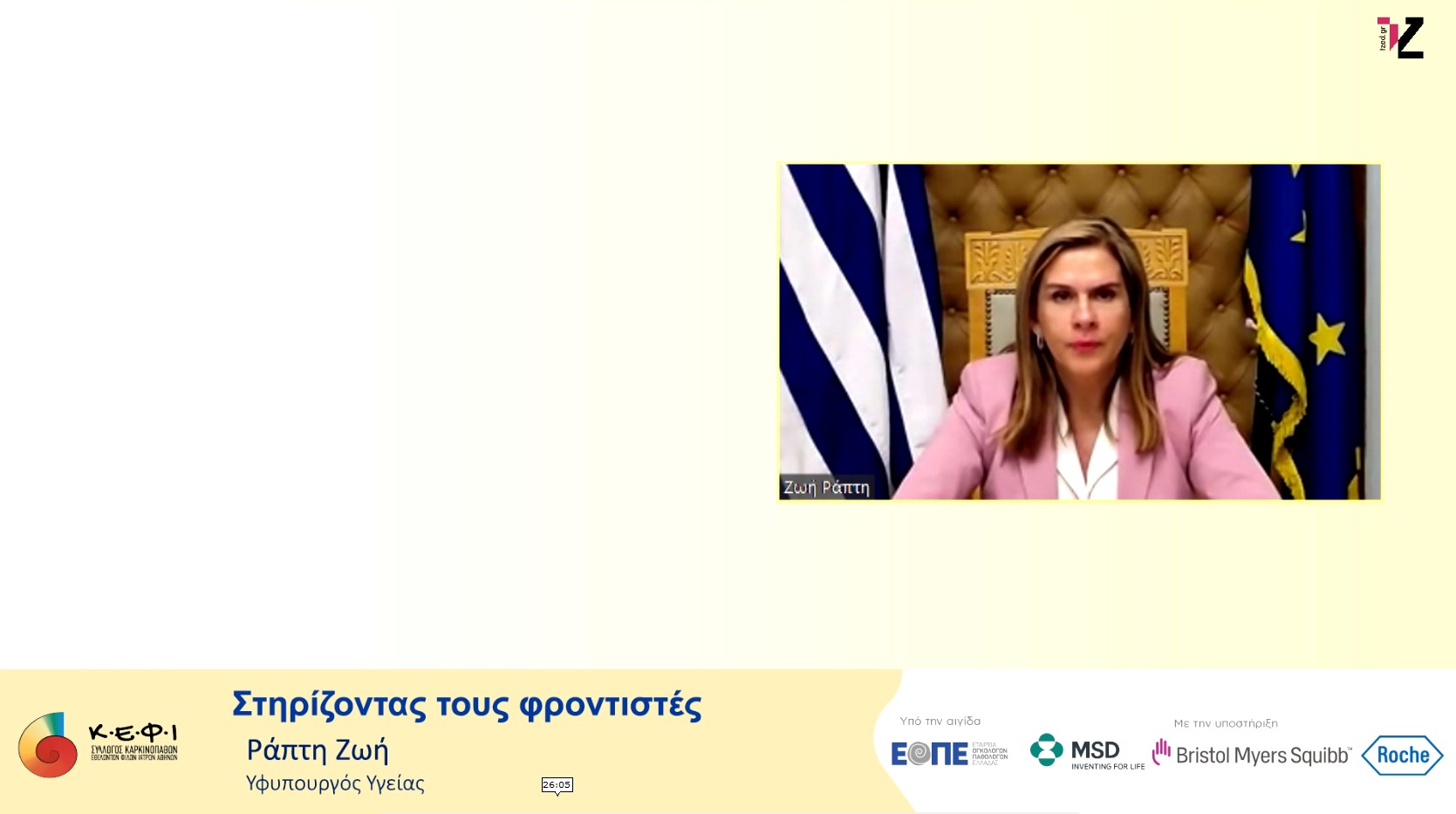 Στη συνέχεια απηύθυνε χαιρετισμό η κυρία Ζωή Ράπτη, Υφυπουργός Υγείας. H κυρία Ράπτη δήλωσε ότι είναι στις προτεραιότητες της Πολιτείας η υποστήριξη των φροντιστών, η οποία προωθείται με την παροχή τηλεφωνικής γραμμής ψυχολογικής υποστήριξης αλλά και με εφαρμογές τηλεϊατρικής όπου μπορούν να προγραμματίσουν εξ αποστάσεως ραντεβού όσοι το έχουν ανάγκη, με έμφαση στις ακριτικές περιοχές της χώρας. Μαζί με τη δημιουργία μητρώου ασθενών με καρκίνο, που βρίσκεται σε εκκρεμότητα, θα πρέπει να δημιουργηθεί και ανάλογο μητρώο φροντιστών.
