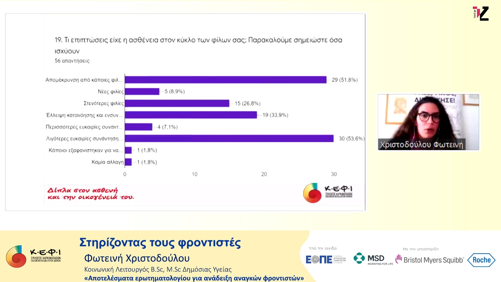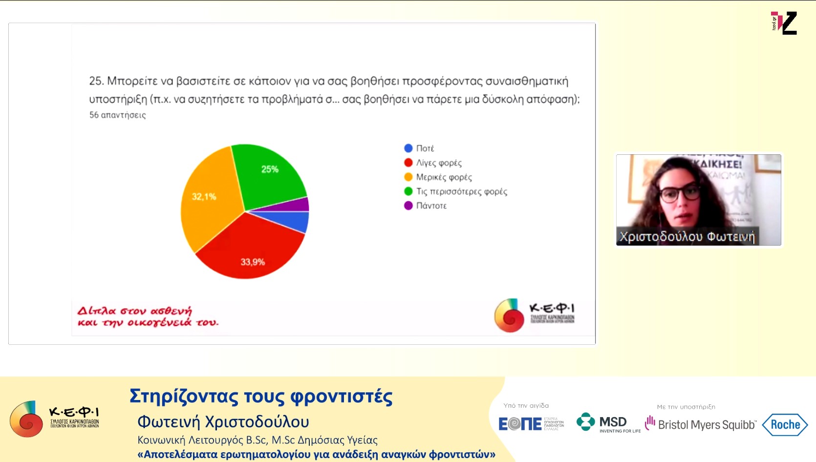 Τον κύκλο των ομιλιών έκλεισε η κυρία Φωτεινή Χριστοδούλου, Κοινωνική Λειτουργός B.Sc, M.Sc Δημόσιας Υγείας, η οποία παρουσίασε τα αποτελέσματα της έρευνας που διεξήγαγε ο Σύλλογος Κ.Ε.Φ.Ι. για την ανάδειξη των αναγκών των φροντιστών. Από τα αποτελέσματα της έρευνας φαίνεται ότι είναι πολύ πιθανότερο τον ρόλο του φροντιστή να τον έχει γυναίκα, ενώ 3 στους 4 φροντιστές δήλωσαν ότι διαμένουν μαζί με τον ασθενή. 8 στους 10 φροντιστές αισθάνονται άγχος, φόβο και θλίψη, σχεδόν 6 στους 10 νιώθουν αβεβαιότητα, ενώ σημαντικό ποσοστό των φροντιστών δήλωσε ότι βιώνει θυμό, απελπισία και μοναξιά. Οι μισοί από τους ερωτηθέντες δήλωσαν ότι έχουν διαγνωστεί με κατάθλιψη, αλλά μόνο το 50% των διαγνωσμένων έλαβε φαρμακευτική αγωγή ή ψυχολογική υποστήριξη για να την αντιμετωπίσει. Η πλειοψηφία των ερωτηθέντων απάντησαν ότι εκτός από τις ψυχολογικές επιπτώσεις έχει επηρεαστεί και η οικογενειακή και κοινωνική τους ζωή, ενώ 8 στους 10 είχαν αρνητικό αντίκτυπο στην οικονομική κατάσταση του νοικοκυριού τους εξαιτίας του καρκίνου. Το 48 % των ερωτηθέντων δήλωσε ότι αναζήτησε υποστήριξη σε κάποια οργάνωση ασθενών, ενώ η πλειοψηφία όσων δεν το έκαναν δήλωσαν ότι δεν γνώριζαν για την ύπαρξη τέτοιων φορέων και υπηρεσιών.