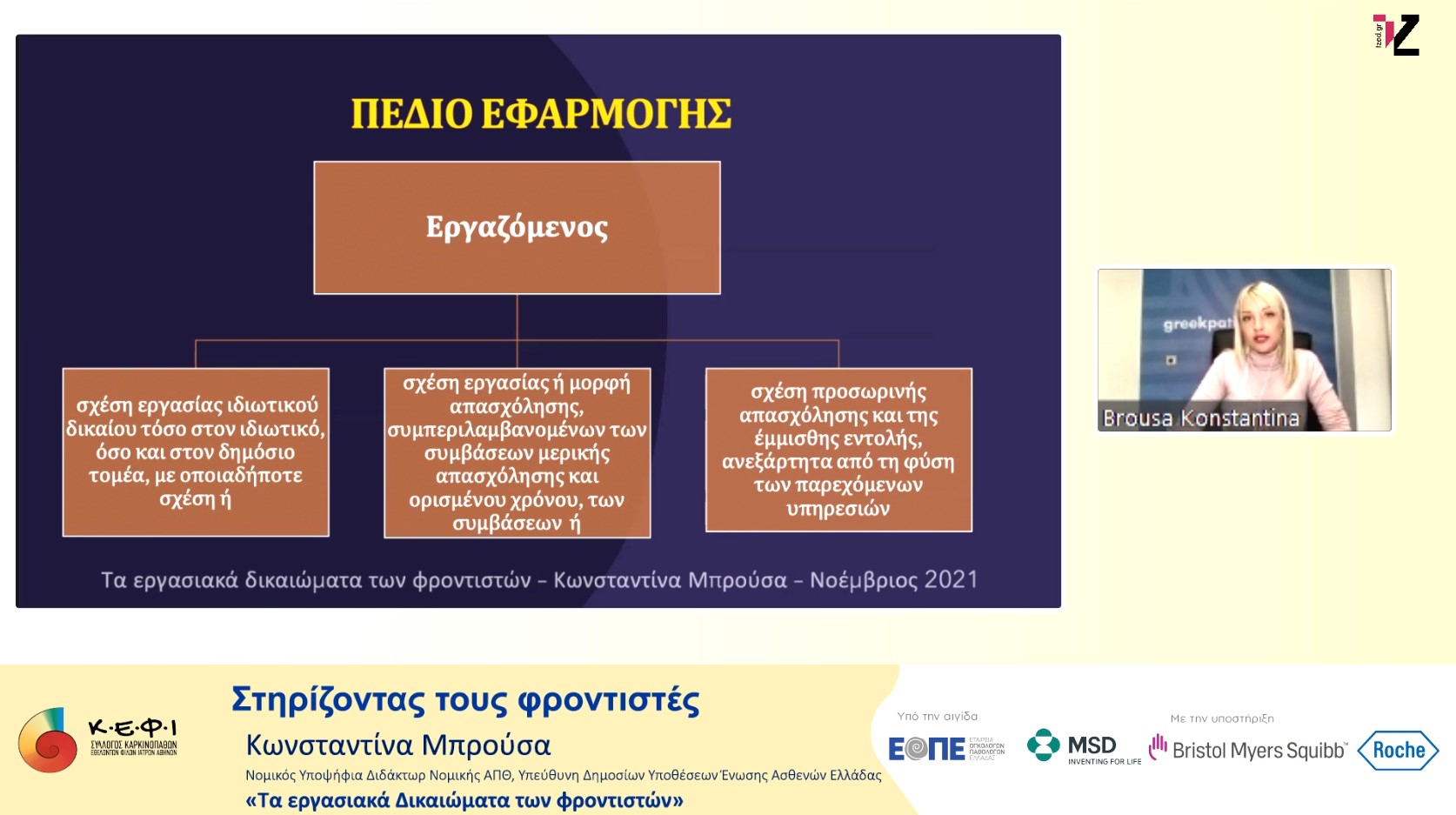 Ακολούθως η κυρία Κωνσταντίνα Μπρούσα, Νομικός, Υποψήφια Διδάκτωρ Νομικής ΑΠΘ και Υπεύθυνη Δημοσίων Υποθέσεων της Ένωσης Ασθενών Ελλάδας παρουσίασε τα εργασιακά δικαιώματα των φροντιστών. Η κα Μπρούσα ανέφερε ότι με τον Ν.4808/2021 που ενσωματώνει σχετική Κοινοτική οδηγία, προβλέπεται άδεια φροντιστή έως 5 ημέρες τον χρόνο, άνευ αποδοχών, με προϋπόθεση την συμπλήρωση 6 μηνών απασχόλησης στον ίδιο εργοδότη. Η συγκεκριμένη άδεια χρησιμοποιείται για φροντίδα συγγενή ή προσώπου που κατοικεί στο ίδιο νοικοκυριό με τον ασθενή και ο σοβαρός ιατρικός λόγος για τον οποίο χρειάζεται η άδεια βεβαιώνεται με ιατρική γνωμάτευση. Επίσης, υπάρχει η δυνατότητα απουσίας για λόγους ανωτέρας βίας, έως δύο φορές το χρόνο για μία ημέρα κάθε φορά και προορίζεται για επείγοντα οικογενειακά ζητήματα για σοβαρή ασθένεια ή ατύχημα. Η κα Μπρούσα επεσήμανε επίσης ότι απαγορεύεται κάθε δυσμενής ή λιγότερο ευνοϊκή μεταχείριση εργαζομένων, επειδή ζήτησαν ή έλαβαν άδεια ή ευέλικτη ρύθμιση ή άσκησαν τα δικαιώματα που προβλέπονται.