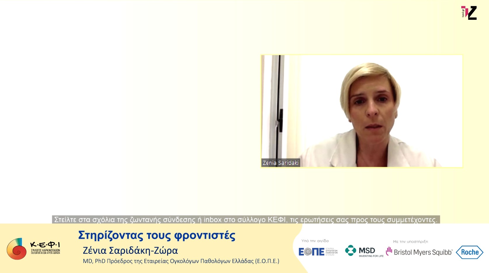 Ακολούθησε η ομιλία της κυρίας Ζένιας Σαριδάκη-Ζώρα, MD, PhD και Πρόεδρος της Εταιρείας Ογκολόγων Παθολόγων Ελλάδας (Ε.Ο.Π.Ε.) με θέμα τη συμβολή του φροντιστή στη θεραπεία του ογκολογικού ασθενή. Η κυρία Σαριδάκη ανέφερε ότι το 80% της φροντίδας ενός ασθενή παρέχεται από άτυπο φροντιστή και τόνισε την αναγκαιότητα να αναγνωριστεί ο ρόλος τους. Τα καθήκοντα που επωμίζονται οι φροντιστές ποικίλλουν, από την πρακτική φροντίδα του ασθενή έως την ψυχοσυναισθηματική υποστήριξή του, με αντίστοιχη επιβάρυνση της ψυχικής τους υγείας. Αυτό που λείπει στη χώρα μας είναι η παροχή υποστήριξης από την Πολιτεία είτε σε επίπεδο οικονομικής στήριξης είτε σε επίπεδο ουσιαστικής πληροφόρησης για τυχόν υπηρεσίες που θα μπορούσαν να χρησιμοποιήσουν είτε σε επίπεδο πρακτικών διευκολύνσεων.