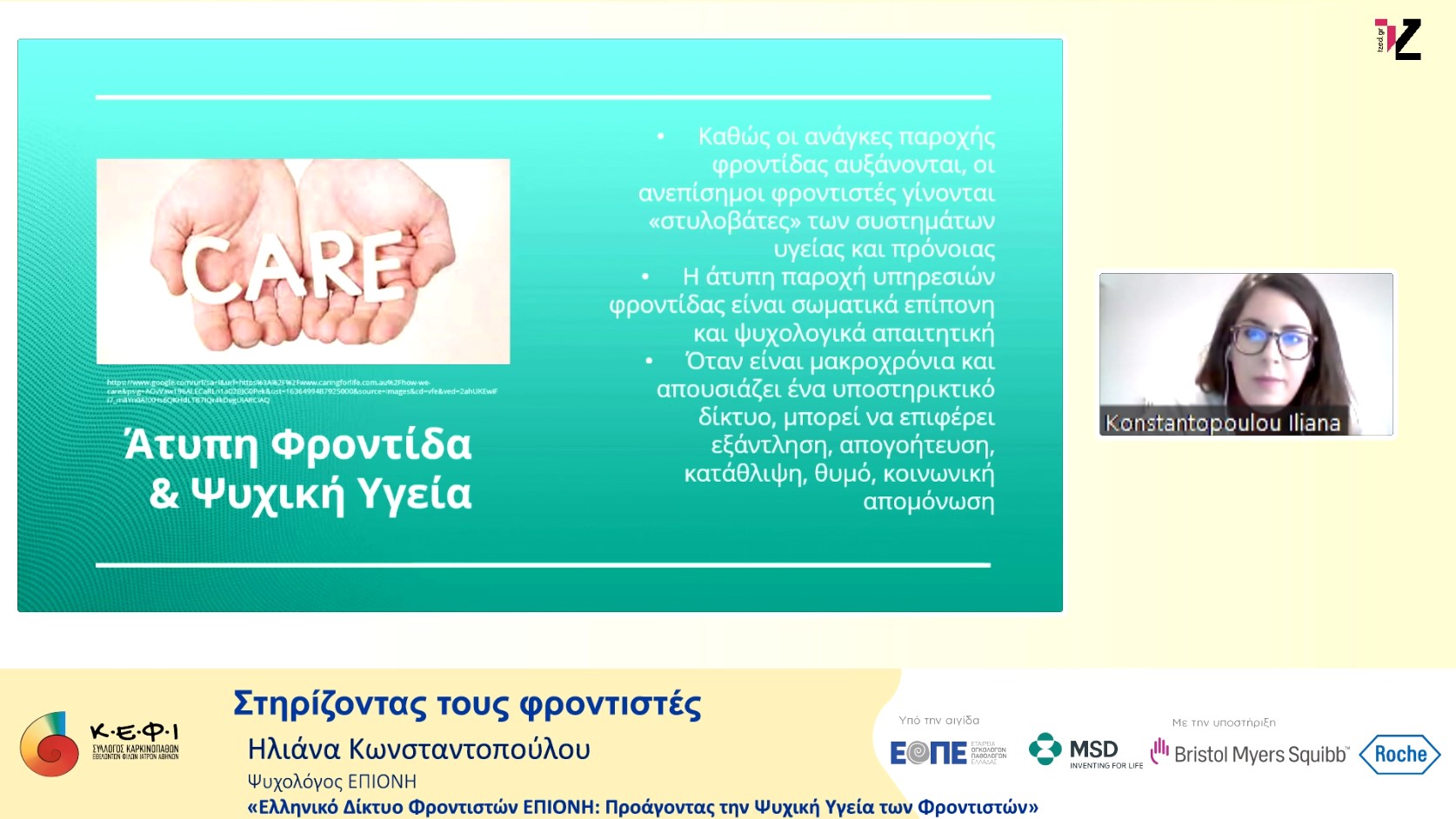 Επόμενη ομιλήτρια ήταν η κυρία Ηλιάνα Κωνσταντοπούλου, Ψυχολόγος του Ελληνικού Δικτύου Φροντιστών ΕΠΙΟΝΗ, η οποία αναφέρθηκε στους τρόπους ενίσχυσης της ψυχικής υγείας των φροντιστών. Η κα Κωνσταντοπούλου ανέφερε ότι αυτή τη στιγμή στην Ελλάδα υπολογίζεται ότι υπάρχουν πάνω από 3 εκατομμύρια άτυποι φροντιστές! Τρόποι υποστήριξης των φροντιστών είναι η παροχή επαρκούς και εντατικής φροντίδας από επίσημους φορείς, η εκπαίδευση και η συμβουλευτική των φροντιστών, τα διαλείμματα από τα καθήκοντα φροντίδας τους και η μέριμνα για τα εργασιακά τους δικαιώματα. Η άτυπη φροντίδα επιβαρύνει ψυχολογικά τους φροντιστές οι οποίοι ρισκάρουν να γίνουν και οι ίδιοι ασθενείς, Η αυξανόμενη ζήτηση απαιτεί τη λήψη σχετικών μέτρων για τη διαφύλαξη της ψυχικής τους υγείας. Απαιτούνται πολιτικές επαρκούς φροντίδας και μέτρα στήριξης των φροντιστών από την Πολιτεία.