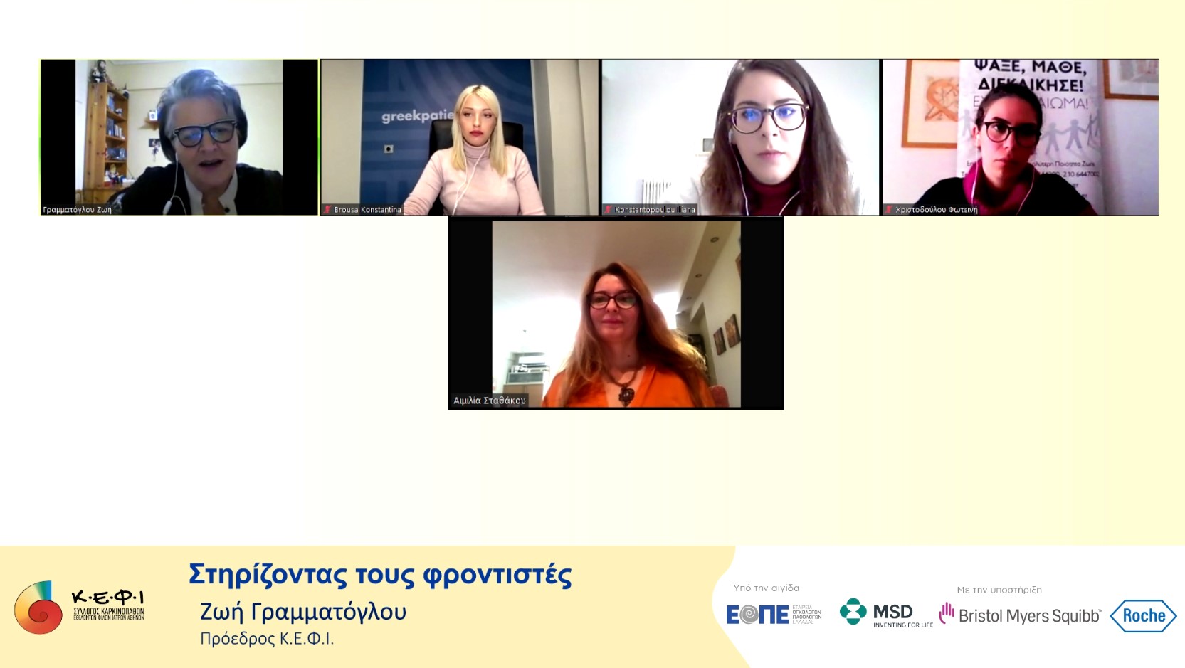 Αρχικά η κυρία Ζωή Γραμματόγλου, Πρόεδρος Δ.Σ. του Συλλόγου Κ.Ε.Φ.Ι. αναφέρθηκε στη σημασία του ρόλου του φροντιστή. Ως φροντιστής ορίζεται κάποιος που προσφέρει αμισθί φροντίδα σε ασθενή με μακροχρόνια ασθένεια ή αναπηρία. Συνήθως πρόκειται για σύζυγο/σύντροφο, γονέα, αδελφό ή ενήλικο παιδί του ασθενή. Το τυπικό προφίλ του φροντιστή στη χώρα μας είναι γυναίκες 45-75 ετών. Ο φροντιστής καλείται να αναλάβει συμπληρωματικά τη νοσηλευτική φροντίδα του ασθενή στο νοσοκομείο και αποκλειστικά στο σπίτι, την παροχή ψυχολογικής υποστήριξης, οικιακής φροντίδας, διαχείριση των οικονομικών του ασθενή. Η κυρία Γραμματόγλου έκανε έκκληση στην Πολιτεία να αναγνωρίσει τον ρόλο του φροντιστή ασθενών με καρκίνο, να αποτιμηθεί η συμβολή του και θεσμοθετηθεί τυπική αποζημίωση και να υπάρξει σχετική πρόβλεψη στην Εθνική Στρατηγική Υγείας και Απασχόλησης.