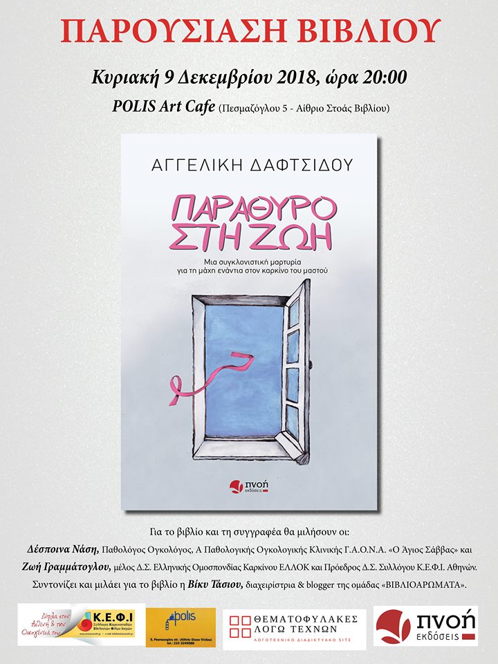 Οι Εκδόσεις ΠΝΟΗ οργανώνουν παρουσίαση του βιβλίου της Αγγελικής Δαφτσίδου "Παράθυρο στη ζωή", την Κυριακή 9 Δεκεμβρίου 2018, στις 20.00 στο POLIS Art CAfe (Πεσμαζόγλου 5, Αίθριο Στοάς Βιβλίου).