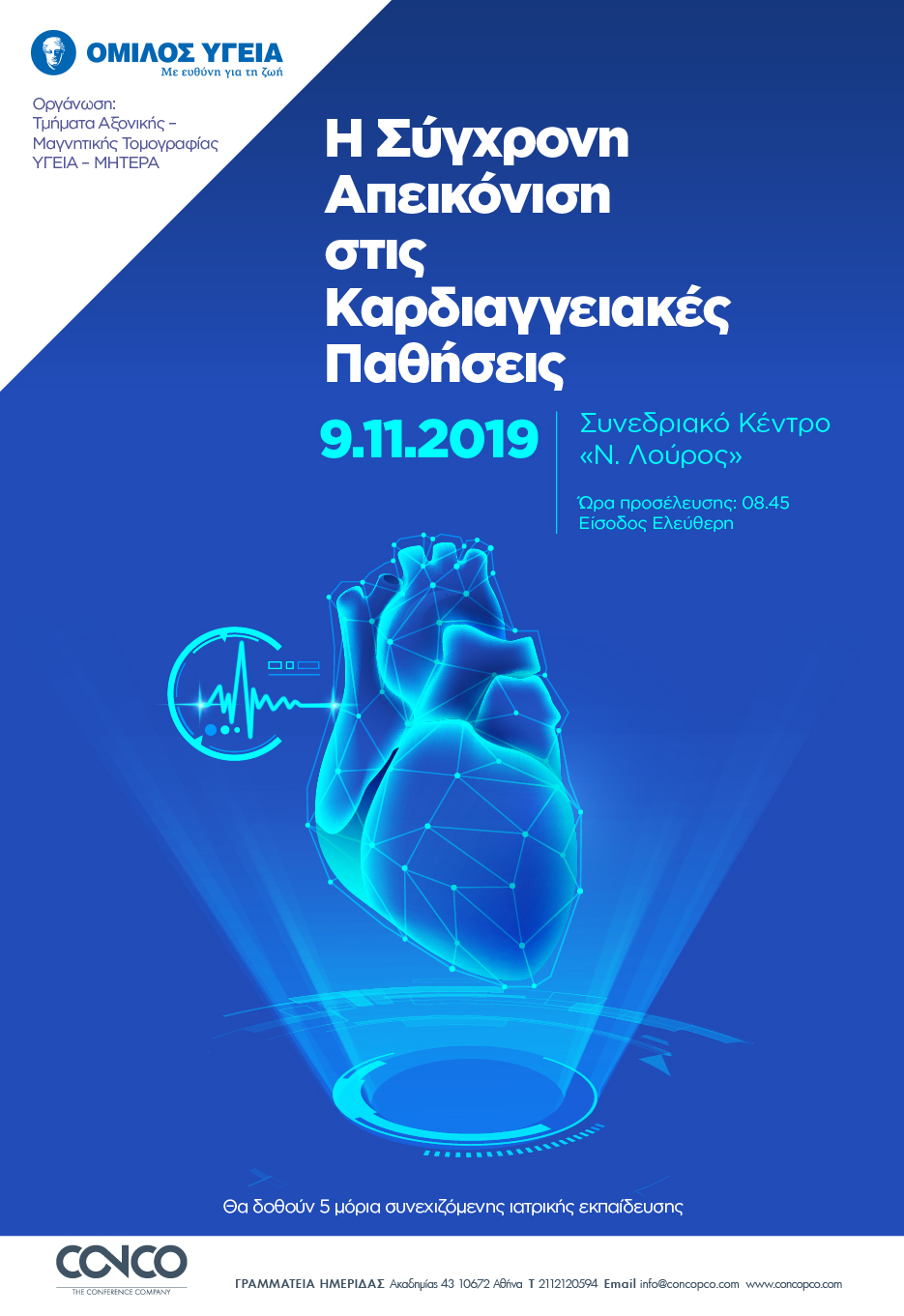 Ο Όμιλος Υγεία πραγματοποιεί Ημερίδα με θέμα «Η Σύγχρονη Απεικόνιση στις Καρδιαγγειακές Παθήσεις» που θα διεξαχθεί το Σάββατο 9 Νοεμβρίου 2019 και ώρα 08:45, στο Συνεδριακό Κέντρο «Ν. Λούρος», ΜΗΤΕΡΑ και διοργανώνεται από τα Τμήματα Αξονικής – Μαγνητικής Τομογραφίας ΥΓΕΙΑ - ΜΗΤΕΡΑ.
