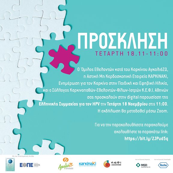 Ο Σύλλογος Καρκινοπαθών – Εθελοντών – Φίλων – Ιατρών «Κ.Ε.Φ.Ι.» Αθηνών, o Όμιλος Εθελοντών Κατά του Καρκίνου «ΑγκαλιάΖΩ» και η Αστική Μη Κερδοσκοπική Εταιρεία για τον Καρκίνο της Παιδικής Hλικίας «ΚΑΡΚΙΝΑΚΙ» σας προσκαλούν να παρακολουθήσετε τη Συνέντευξη Τύπου για την "Ελληνική Συμμαχία για τον HPV" την Τετάρτη 18 Νοεμβρίου 2020 και ώρα 11 πμ.